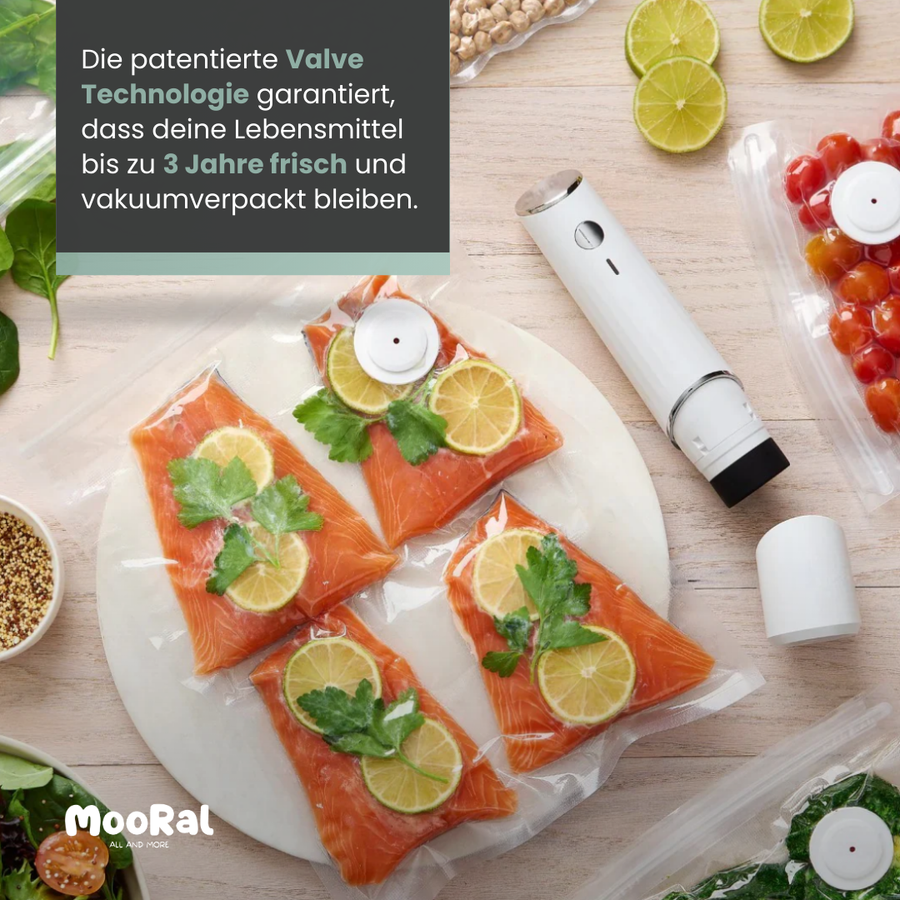 Durch das luftdichte Versiegeln können Lebensmittel bis zu 5x länger frisch bleiben – einige Lebensmittel sogar bis zu 3 Jahre! Perfekt für Fleisch, Fisch, Gemüse oder trockene Vorräte.